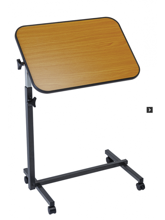 Duży zakres regulacji, laminowany blat z podwyższonymi krawędziami, zabezpieczającymi przedmioty przed zsuwaniem się.