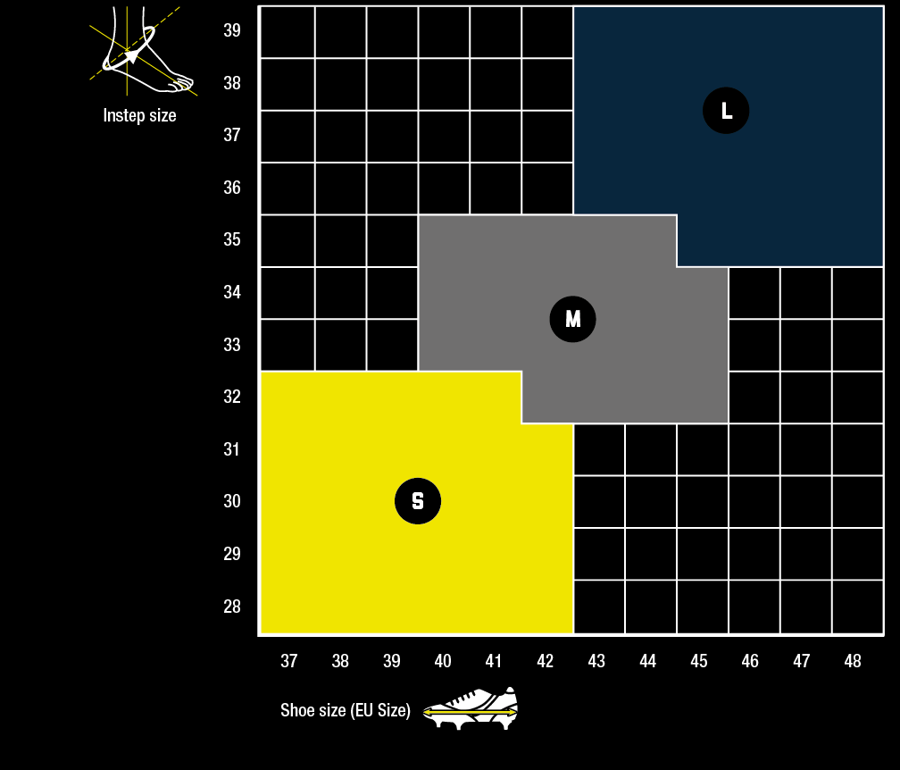 Właściwy rozmiar dobieramy mierząc obwód przez piętę w cm i dobierając do rozmiaru obuwia.