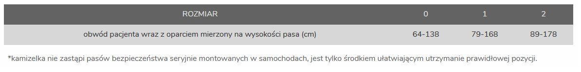W celu ułatwienia zapinania poszczególnych taśm zostały one oznaczone tym samym kolorem (granat, żółty, pomarańczowy), zapewniają one również możliwość regulacji na długość. Kamizelka posiada wszyty zamek błyskawiczny, który pozwala na otwarcie kamizelki z przodu i swobodne podjęcie pacjenta z siedziska, dzięki takiemu rozwiązaniu nie ma potrzeby odpinania i zapinania taśm oraz ich regularnej regulacji długości podczas zapinania tej samej osoby.