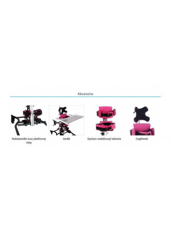 Pionizacja to również czas na zabawę i naukę dlatego zarówno w pionizacji przedniej jak i tylnej urządzenie oferuje możliwość zamontowania dużego prostokątnego stolika ułatwiającego prowadzenie zajęć terapeutycznych. Stosowany w pozycji pionizacji przedniej jak również tylnej.