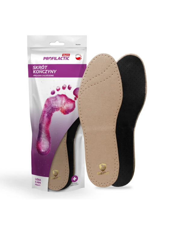 Wkładki LIDIA są wyrobem medycznym dedykowanym osobom ze skrótem kończyny. Sztywny korkowy klin w pięcie użyty jest w prawej i lewej wkładce, dlatego jeżeli zależy nam na podparciu jednej stopy wkładamy tylko jedną w buty. To rozwiązanie jest jednak używane również jako wizualne zwiększenie wzrostu bez potrzeby użycia obcasów.