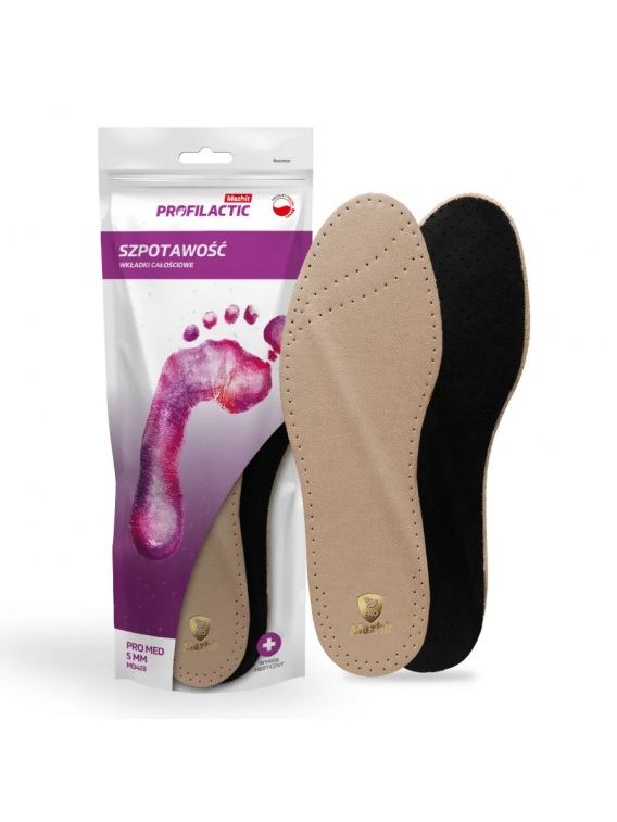 Wkładki PRO MED dedykowane są osobom ze szpotawością tyłostopia. Sztywny klin korkowy zaczynający się w pięcie a kończący się pod głowami kości śródstopia, koryguje stopę o 5 lub 10 mm.