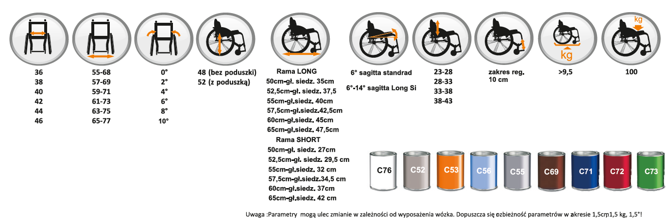 Oś koła tylnego - system zmiany środka ciężkości wózka oraz różne kąty nachylenia kół tylnych 0°,2°,4°,6°, 8°,10°.