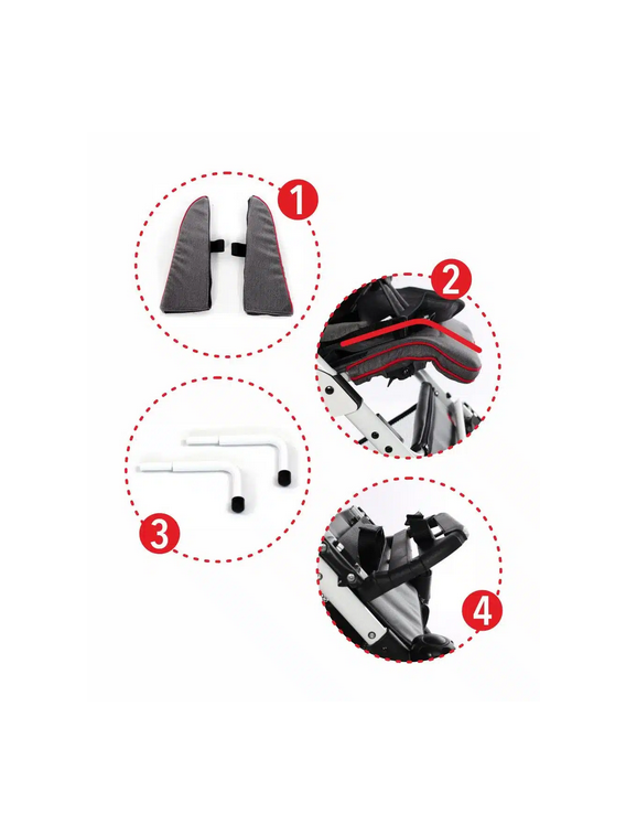 Dołączone do wózka przedłużki oparcia pozwolą nam wydłużyć je z 50 do 60 cm. Regulowana dolna krawędź siedziska umożliwia zwiększenie jego głębokości z 24 cm do 30 cm. Chcąc pozostać przy mniejszych rozmiarach możemy zainstalować elastyczne wkładki boczne redukujące szerokość siedziska. Równie pomocny przy modyfikacji parametrów wózka ZEFIR jest regulowany, prosty w montażu i demontażu klin.