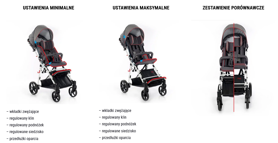 ZEFIR posiada wiele przydatnych funkcji, takich jak możliwość odchylenia oparcia oraz regulacji wysokości mocowania podnóżka. Daje także możliwość zmiany głębokości siedziska (poprzez odgięcie jego krawędzi), jego szerokości (poprzez zainstalowanie wkładek zwężających) oraz wysokości oparcia (poprzez zainstalowanie przedłużek), dzięki czemu rośnie wraz z użytkownikiem.